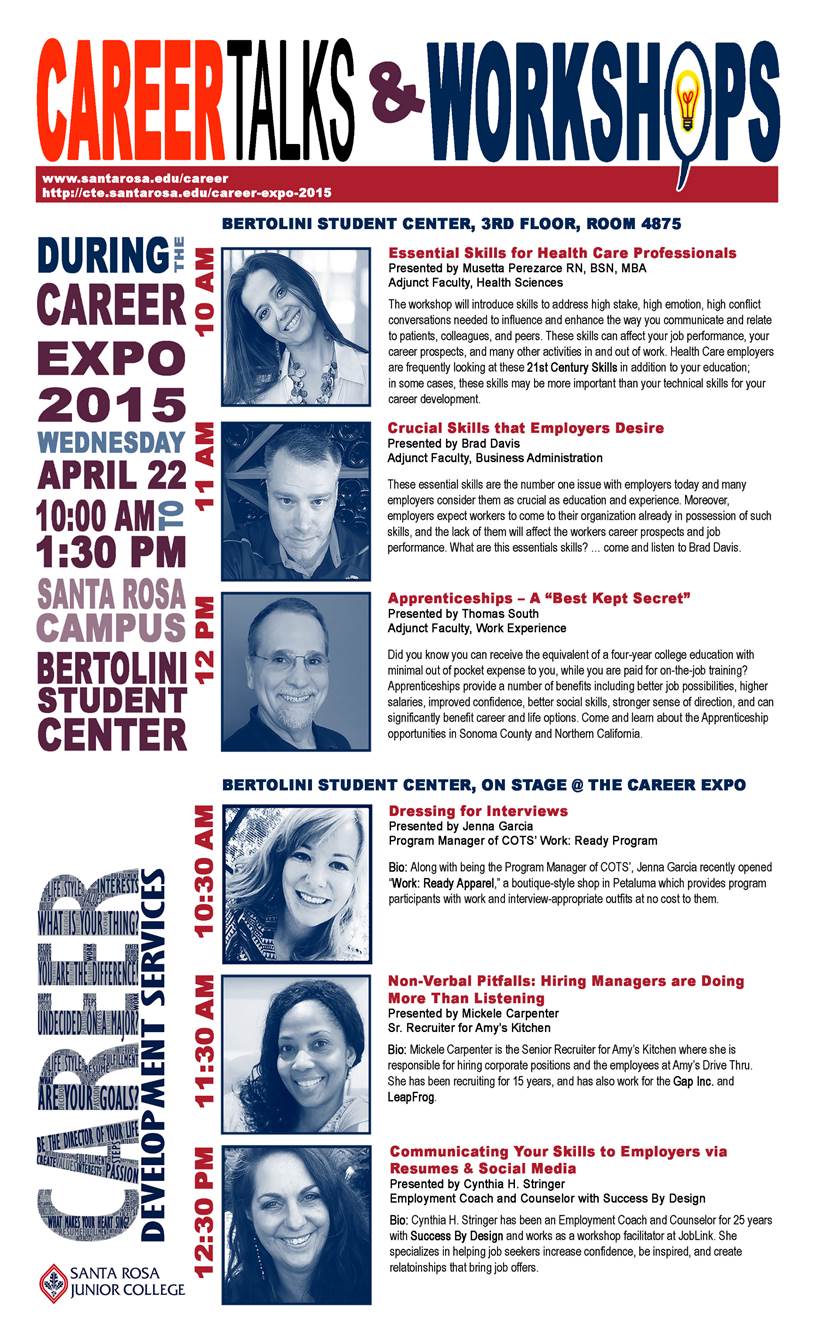 During the Career Expo, the following Career Talks & Workshops<http://www2.santarosa.edu/f/?nEGFFzAZ>will be taking place (a new feature -See schedule<http://cte.santarosa.edu/career-expo-2015>).