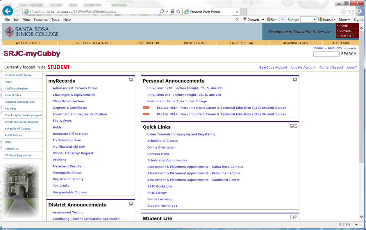We have sent to their MyCubby a message will appear in their "Personal Announcements." As shown in the screen capture below, in their MyCubby, under "Personal Announcements," note the red arrow that says "New." If this message is there, the student HAS NOT completed the survey.