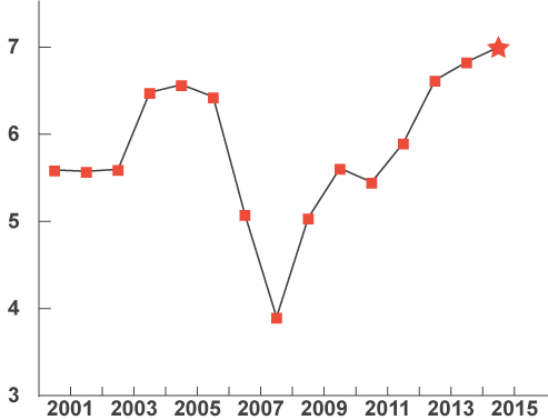 Business confidence in Sonoma County has been consistently strengthening since hitting a low of 3.2 in the winter of 2008. With confidence exceeding pre-recession levels, businesses are more inclined to increase hiring, make capital investments, and