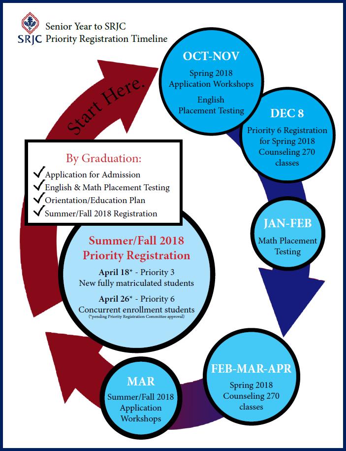 We want to reassure you and your students that the summer and fall class schedules at SRJC are on as planned. Seniors will be able to register as new students next week on April 18th-19th (Priority 3, for students who completed Coun 270) or April 20th (Priority 4, for students who completed an online or in-person orientation.) Concurrent Enrollment students may register during Priority 6 on April 26th.