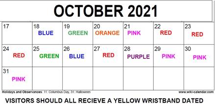 * When the student shows the Safety Monitor they have received a "Cleared4" college access pass (due to vaccination or a negative test) the student will be given a wrist band with the color of the day.