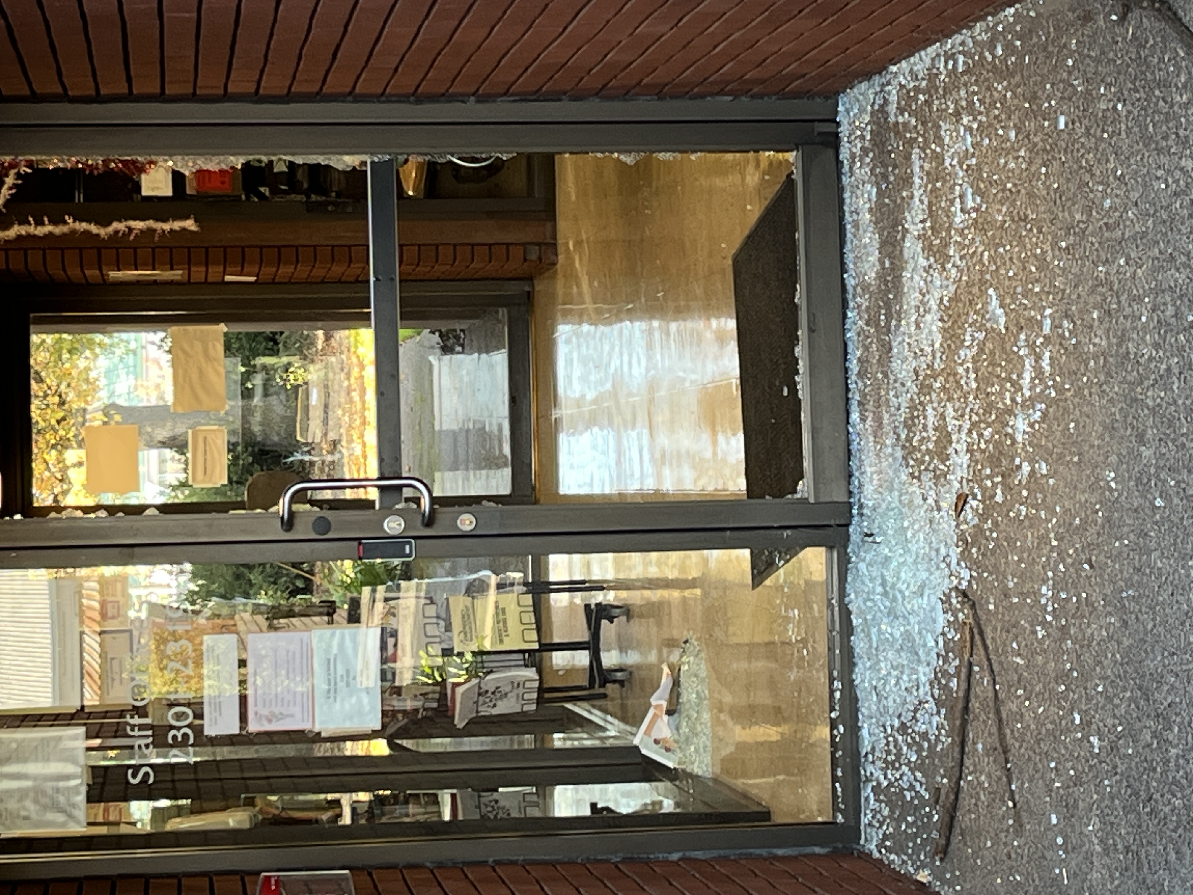 Today (Saturday) Andrew stopped by to work on some paperwork and found the office area broken into and a person wandering around. Campus police responded and detained the person and have secured the crime scene. The state multiple broken glass doors inside.